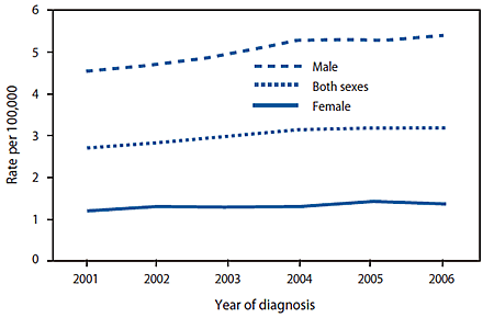 5.4 per 100,000) and women (from 1.2 to 1.4 per 100,000) between